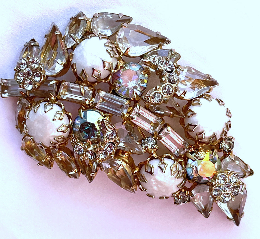 A beautiful leaf shaped brooch with a mixture of different clear rhinestone shapes, as well as four moulded white and prong set stones. The larger clear round rhinestones have an aurora borealis finish which catches the light and projects a rainbow of colours. Overall dimension is 7.5cms x 5.5cms. In perfect condition, set in gold tone metal with a firm roll over safety clasp to the back. Gift boxed by Vintageonline. Free express post within Australia.