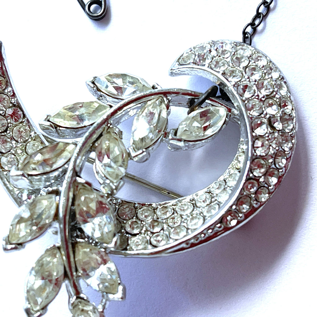 Such a pretty brooch with a sea of colourless rhinestones in a swirl shape with a spray of tear drop shaped rhinestones, each fully faceted to catch the light. Silver tone back with a firm roll over safety clasp. Overall dimension is 4cm x 4cms. In very good condition, with 5cm safety chain which has been attached to keep it safe on a garment. Someone in the past has made sure it would be secure. A stylish accessory to lift any outfit. Gift boxed by Vintageonline.