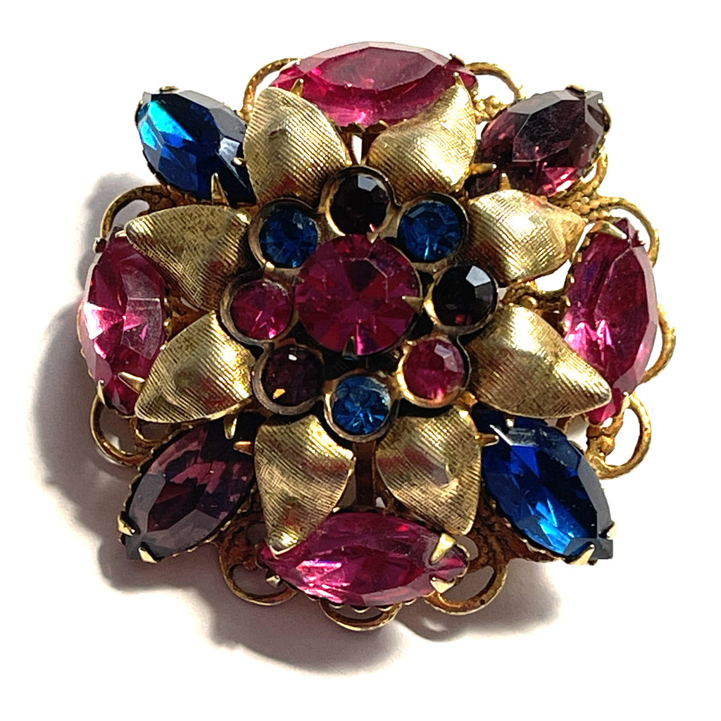 A lovely combination of round and tear drop shaped rhinestones in deep sea blue and vibrant fuschia pink with a circle of gold tone leaf shapes set on a gold tone filigree backing with a firm roll over clasp. Dimension across the brooch is 4cms with a firm roll over safety clasp. In very good pre loved condition - mid century period from USA.. Gift boxed by Vintageonline.