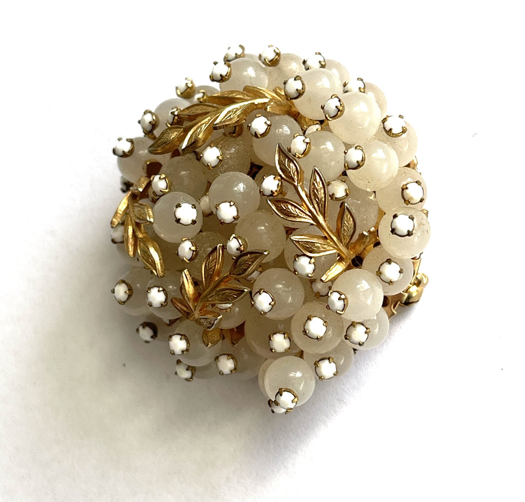 Rifas, a jewellery company based in Chicago USA produced quality costume jewellery during the 1960's period. Little else is known about the company other than the company was started by Frank Rifas, and had a reputation for quality craftmanship featuring quality metals and stones. It is opossible that they also produced jewellery for the D & E Company. Here we have a mass of small stones with the look of moonstone, each one centred with a tiny white milk glass stone, and then enhanced with four gilded leaves. Set in gold tone metal there is a firm roll over safety clasp along with the Rifas signature. True vintage and a highly collectable piece.
