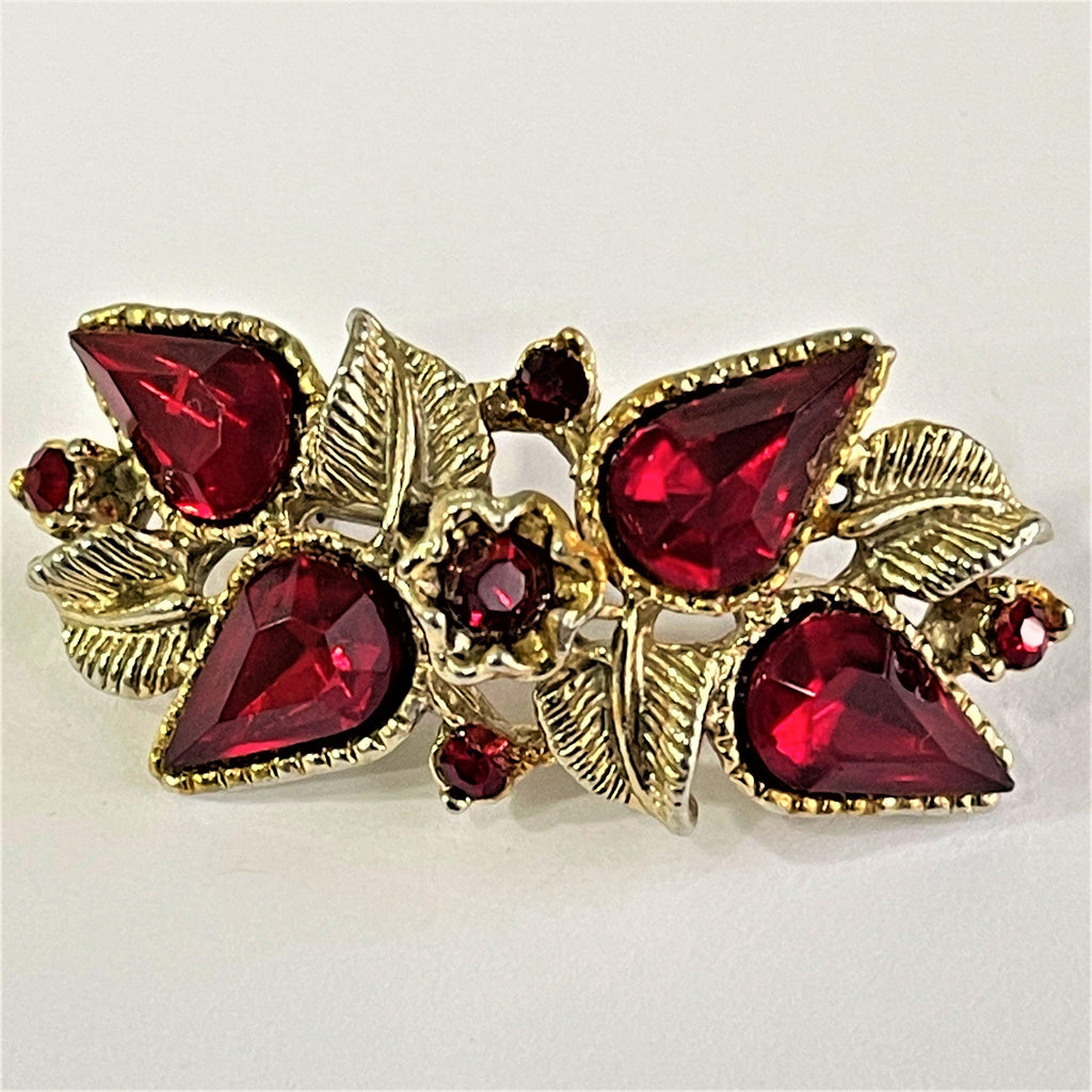 A sweet vintage brooch withy gold tone leaves and ruby coloured rhinestones. Overall dimension is 4cms x 2cms. In excellent condition, gold tone back and firm roll over safety clasp. Gift boxed by Vintageonline.