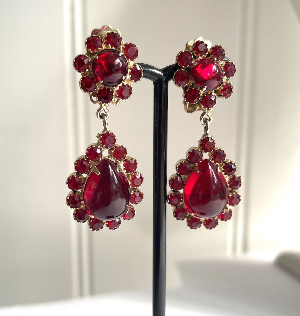 A gorgeous pair of deep red earrings which are thought to be unsigned Schreiner who was a master of twentieth century costume jewellery produced in USA. I am unable to verify that except to say that the quality is very good with some known Schreiner attributes, in particular the little ruffled cabochon that holds the smaller stones. There are clip on components, both firm and comfortable. Length of the drop is 5cm and width of the large tear drop shaped stone with surrounding smaller stones is 2cms. Width of the piece to the ear clip is 1.5cms. Beautiful earrings,in perfect condition, gift boxed by Vintageonline.