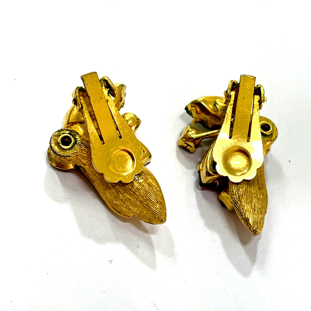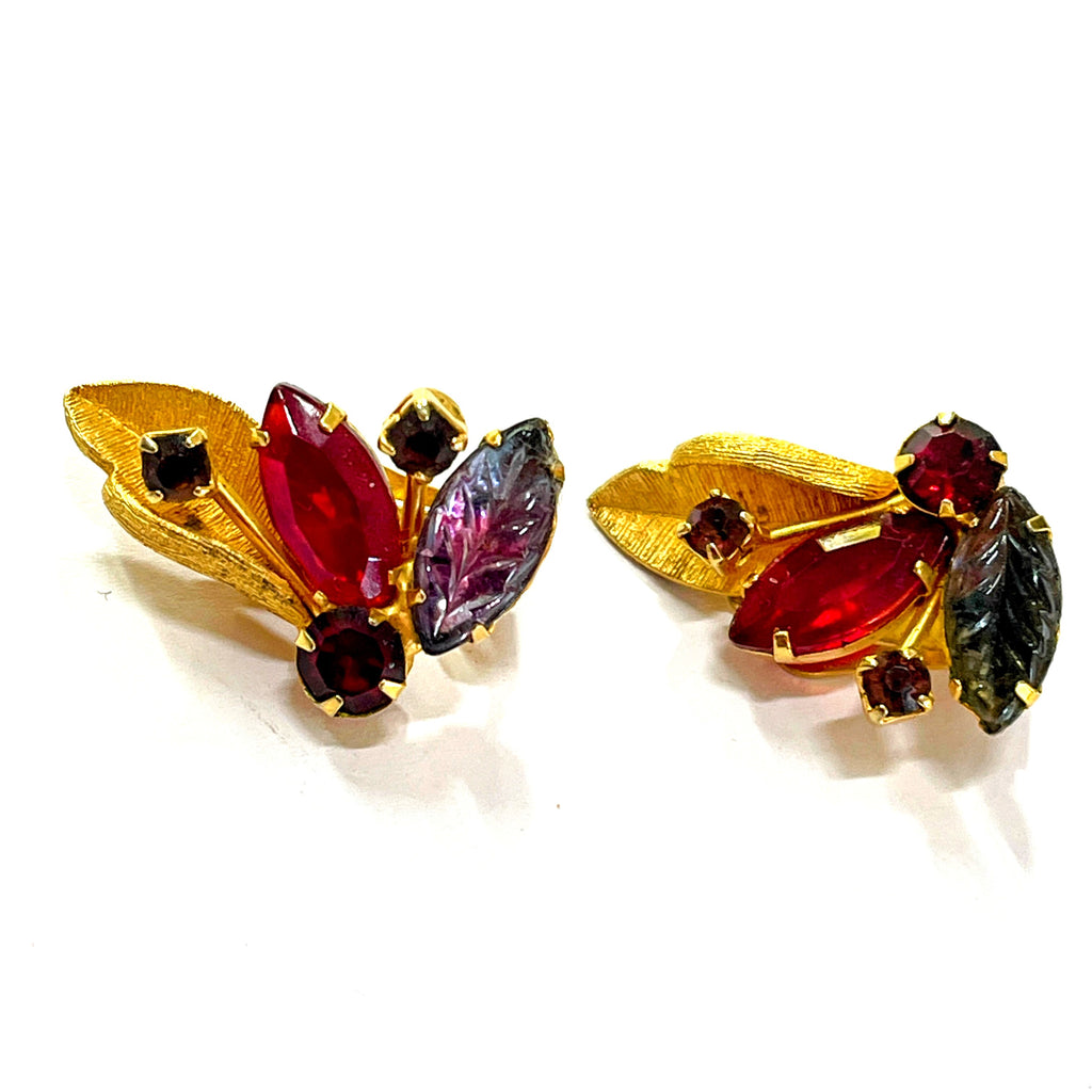Difficult to capture the beauty of these gorgeous rhinestone earrings set in gold tone metal. Two tear drop shaped stones, one a moulded dark grey/lilac and the other deep ruby red, each one prong set, along with three smaller red ruby rhinestones backed by a gold tone leaf. They are clip ons, both firm and comfortable. Overall dimension is 3.5cms x 1.5cms. The perfect gift for yourself or someone you love. Gift boxed by Vintageonline.