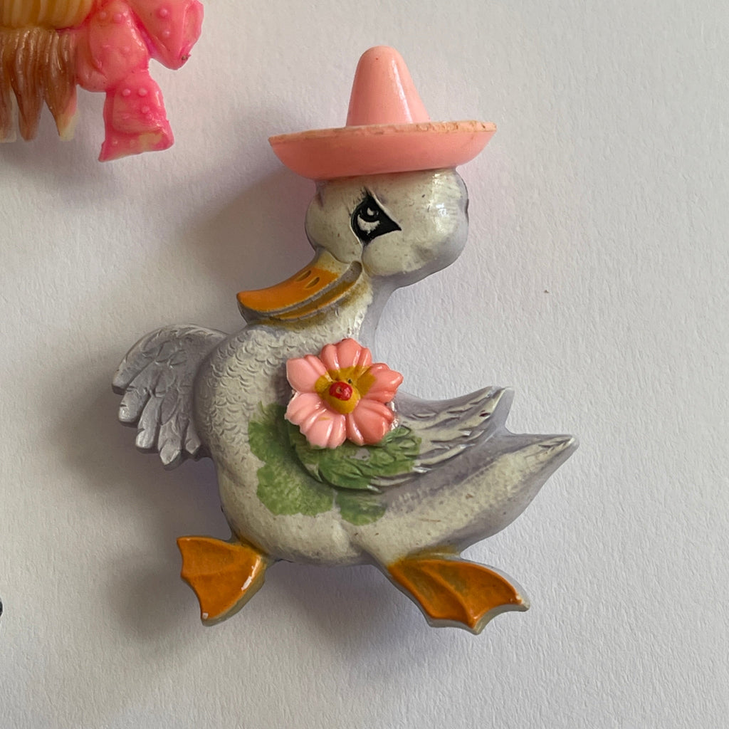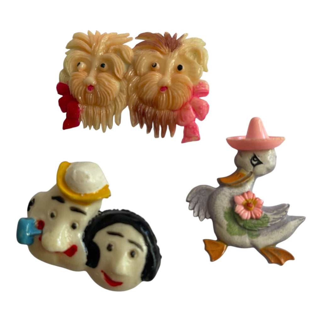 So cute....hard to find Popeye and Olive Oil, along with a double doggie brooch and also a very fancily dressed duck. The dogs are 4.5cm across, the duck 3cm across and Popeye and Olive Oil 4cms across. Each has a well working firm pin to the back. So cute to wear as a threesome or individually. Made from plastic, Authentic 1950's, in good condition, gift boxed by Vintageonline.