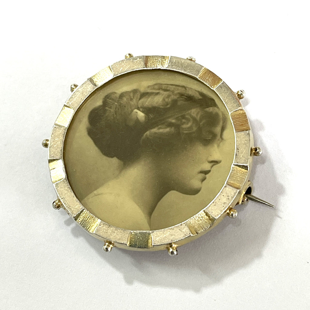 Photography was invented during the Victorian era and photograph jewellery continued to be popular well in to the next century. It was looked upon as a token of love and remembrance. This is a wonderful romantic piece of nostalgia with the photograph of a young woman set in silver frame which is hallmarked for Edward Durban & Co Chester 1923. Edward Durban & Co were silversmiths in Birmingham, but the mark indicates registration in Chester. The photograph sits under celluloid and could be exchanged for another photograph. The back has an interesting clip mechanism similar to the back of an upright frame or paint easel. There is a firm C clasp to the back. Measurement across is 3.5cms. In very good pre loved condition, and gift boxed by Vintageonline.
