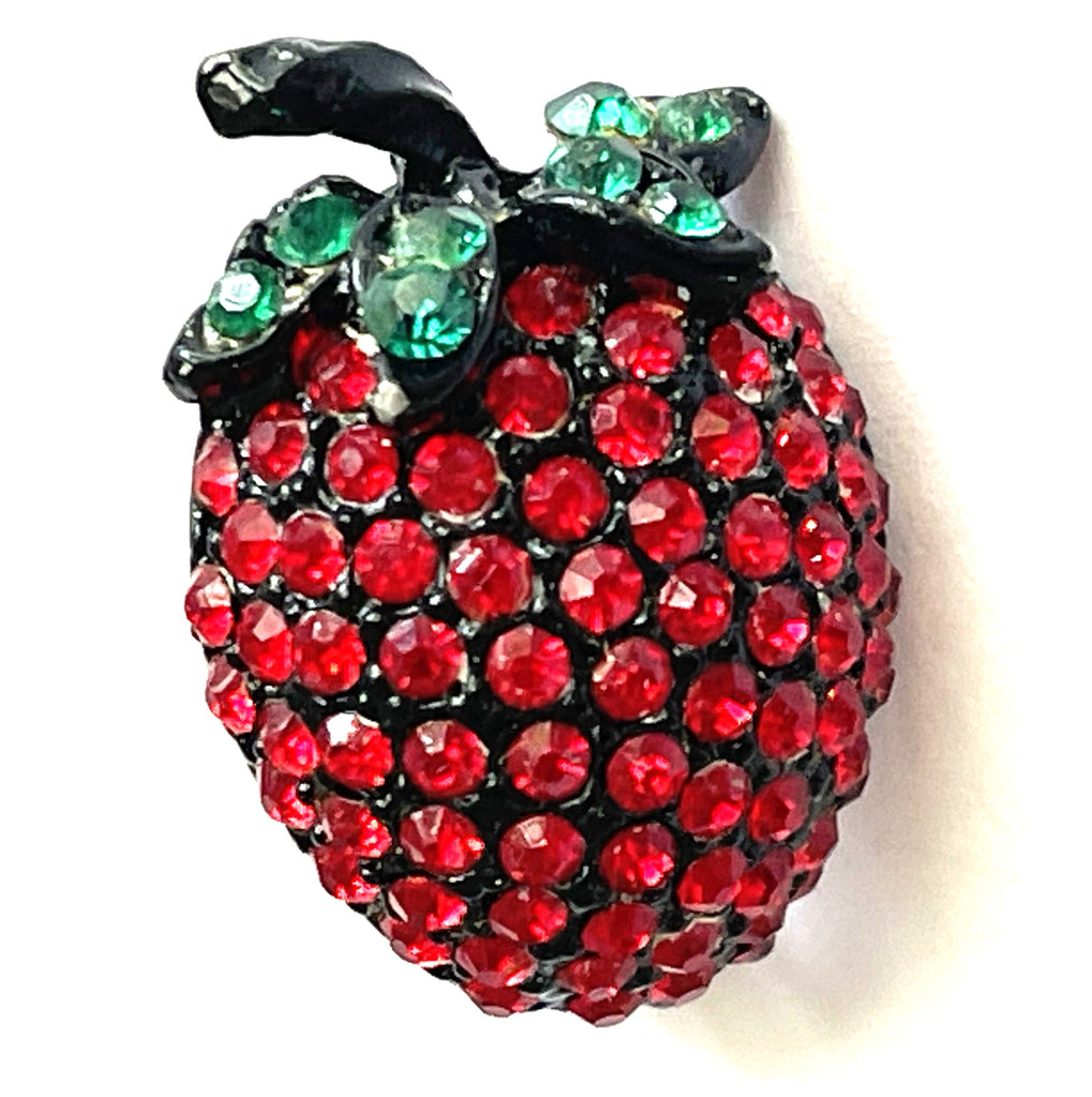 Strawberries were a prolific theme in costume jewellery during the 1950's - 1960's and many of the major costume jewellery companies produced this style in their collections., from Warner, Weiss, to Schreiner. This lovely set is not signed. Perhaps it was produced by one of the major companies, or perhaps designed and made by a smaller unknown company. Recently arrived from USA all three pieces are in perfect condition with japanned backs. The earrings are clip on, firm and comfortable, and each measure 3cms x 2cms. The brooch is the same size as the earrings. The red rhinestones are sparkly and bright as are the green rhinestones forming the leaves. Gift boxed by Vintageonline, and free express postage within Australia.