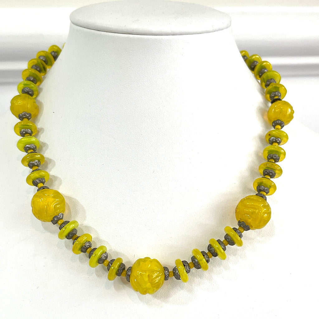 A truly beautiful vibrant yellow necklace with carved glass beads, round rondelles, tiny yellow glass beads, and silver tone separators. Total length end to end is 38cms. From an American estate sale with no provenance but almost certainly a Czech piece. In very good condition, gift boxed by Vintageonline.