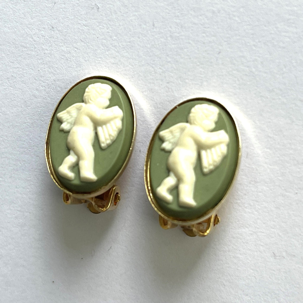 A sweet pair of clip on earrings in the style of the ceramic factory of Wedgewood in the United Kingdom. An oval disc of wedgewood green with a white embossed cherub on each. As new. Overall dimension is 15mm x 18mm. Firm and comfortable fit, in excellent condition, and gift boxed by Vintageonline.