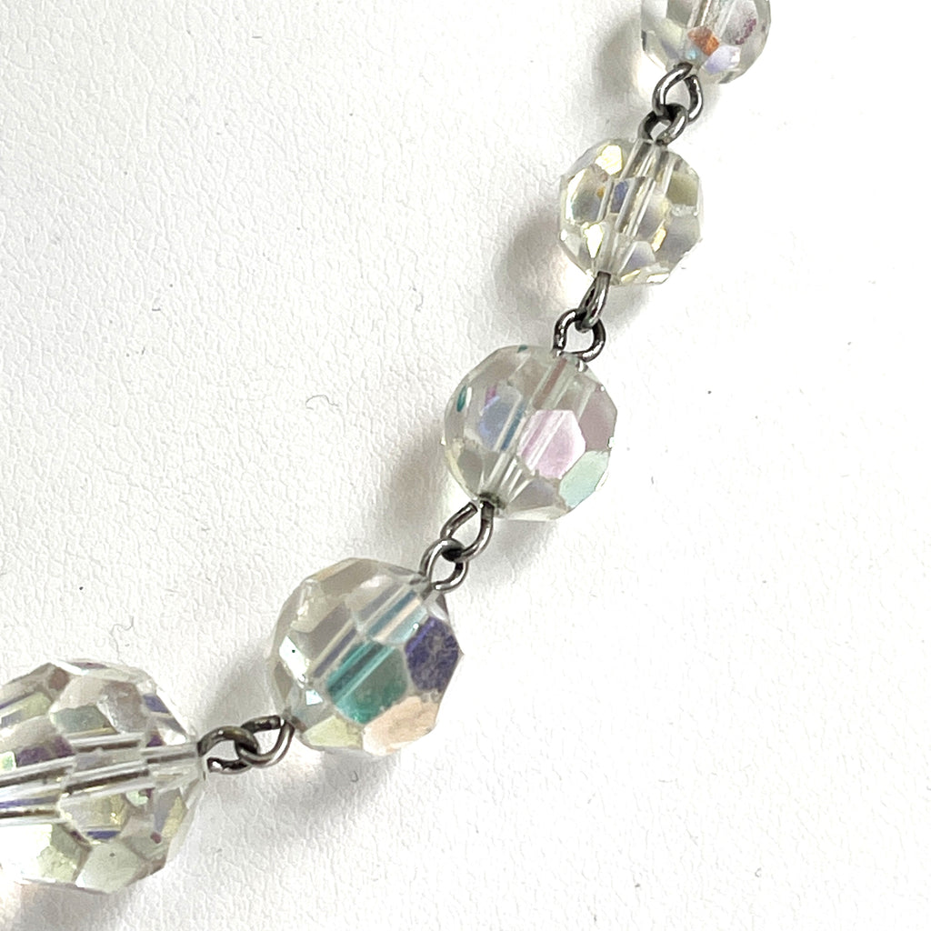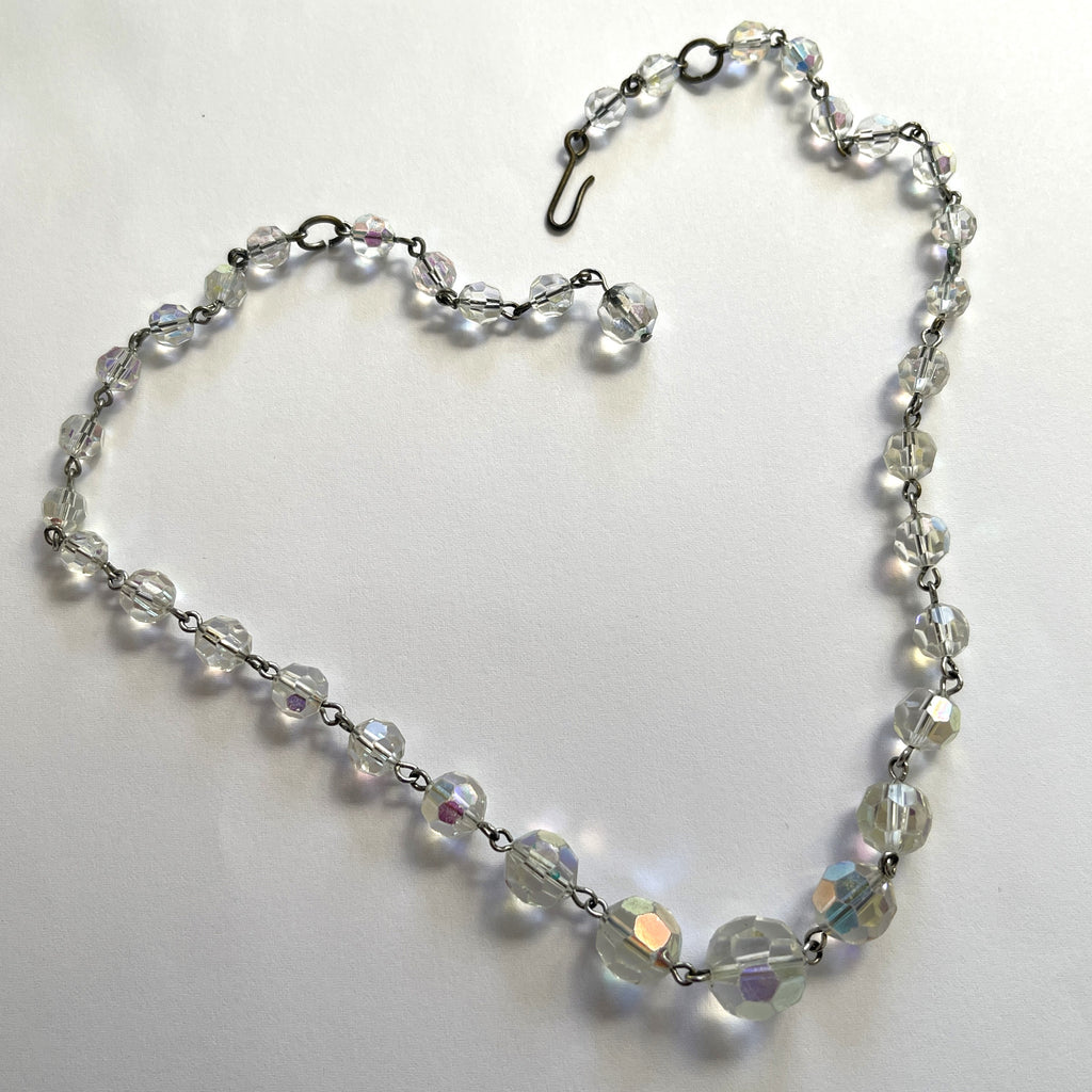 During the 1950's the clear faceted crystal beads were the go to accessory as they go with any outfit at all. This is a lovely single strand each clear crystal glass with aurora borealis finish that catches the light to reflect a rainbow of colours. Graduating from the largest crystal in the front length end to end is 42cms with a plain hook clasp at the end. In very good condition, each crystal wired to the next. Gift boxed by Vintageonline.