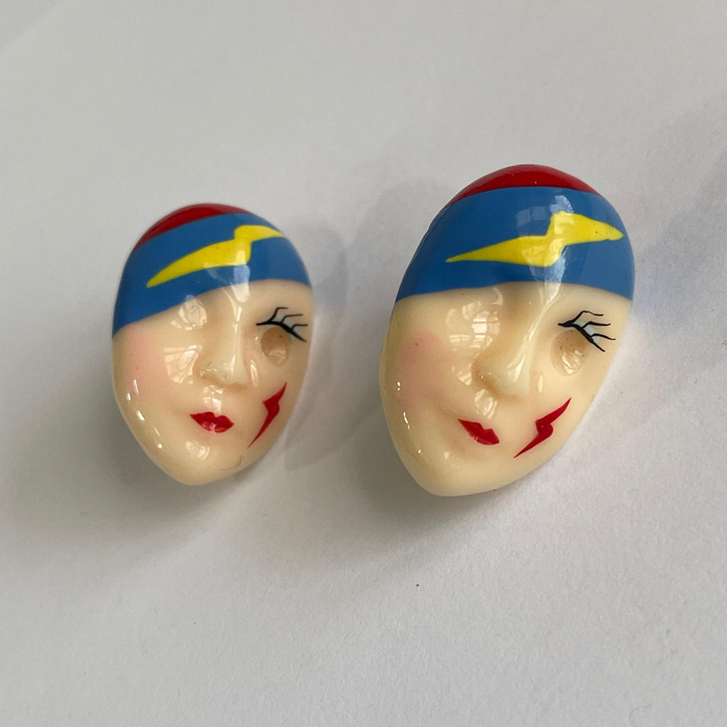 Cute plastic earrings for pierced ears, light and easy to wear depicting the head of a 1920's girl in bathing cap. Overall dimension of each earring is 3.5cms x 2.5cms. In excellent new condition and gift boxed by Vintageonline.