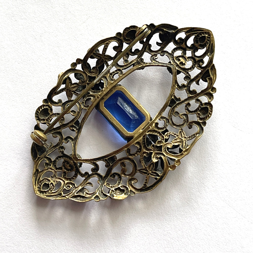 Another beautiful example of Czechoslovakian craftmanship from pre WW11 when Bohemia later Czechoslovakia was the centre of the universe in the production of quality costume jewellery using high standard glass crystals and filigree metal. This is a lovely example with a large rectangular deep sapphire blue stone enhanced with an eye shaped brass tone filigree frame enhanced with coloured glass stones. Overall dimension is 5.5cms x 3.5cms. The pin is a firm roll over safety clasp which is likely a replacement of the C shaped clasp of the time. In very good condition, gift boxed by Vintageonline