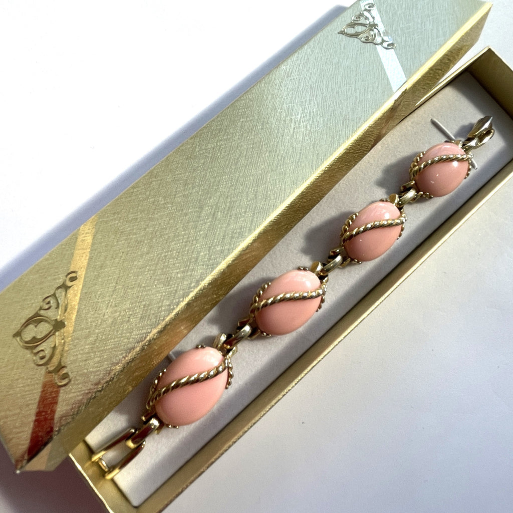 Lucite became very popular in the production of costume jewellery during the 1940's and 1950's at a time when it was harder to utilize more expensive materials. It could be dyed and polished, and is very light and comfortable to wear. It is a high quality acrylic synonymous with that 50's look and is highly collectable today. This is a very pretty pink lucite example with egg shaped discs crossed with twists of gold tone metal. Width of each cabochon is 2cms and length end to end is 18cms. It is in very good pre loved condition showing some very slight wear to the back. Authentic vintage gift boxed by Vintageonline.