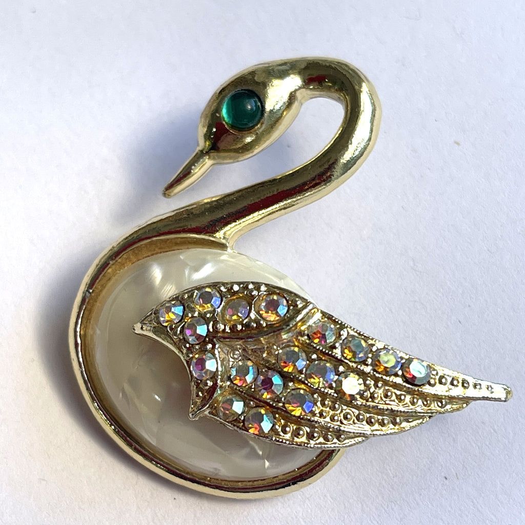 Elegance supreme in this stylish swan brooch with pearlized body, rhinestone studded wings, and green stone eye. Recently arrived from USA. Overall dimension is 4.5cms across and 4.5cms in length. In excellent condition, with firm roll over safety clasp to the back. Gift boxed by Vintageonline.