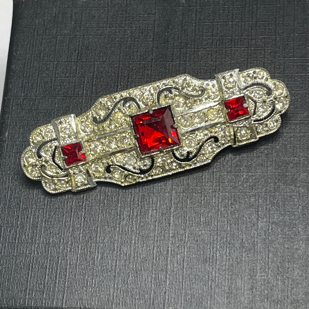 A beautiful brooch recently arrived from USA. Typical in design of the late art deco era. Clear rhinestones set in pot metal with three ruby red square rhinestones. Overall dimension is 6cms x 2cms. There is a firm roll over safety clasp to the back. Very pretty, in excellent condition, gift boxed by Vintageonline.
