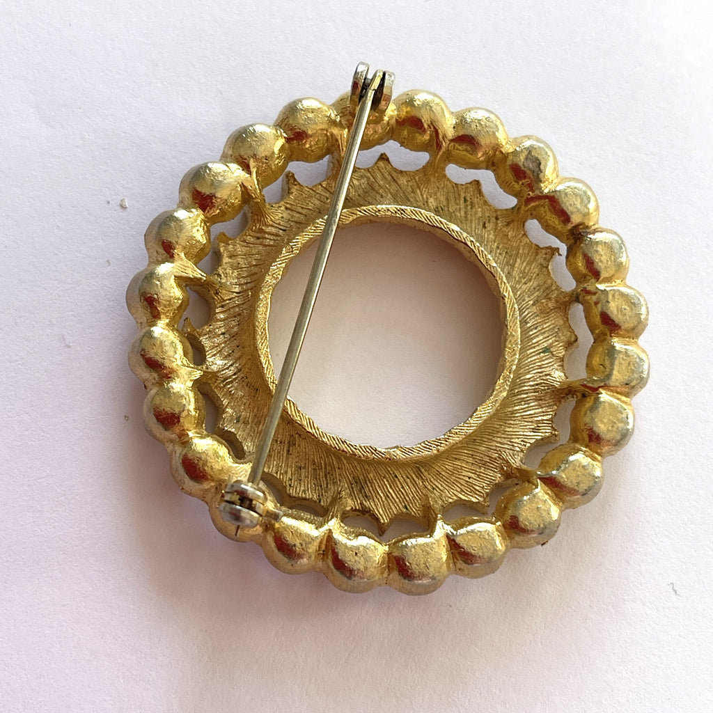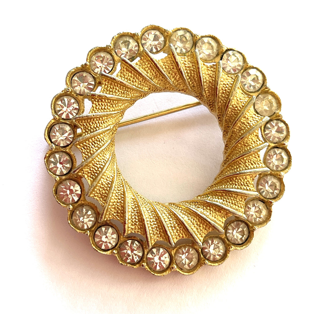 A circle of ridged gold tone metal encircled with colourless rhinestones make this lovely vintage brooch an accessory to lift any outfit from denim to silk. Overall dimension is 5cms across and a firm roll over safety clasp to the back. In very good condition - an 80's period brooch, recently acquired from USA. Gift boxed by Vintageonline.