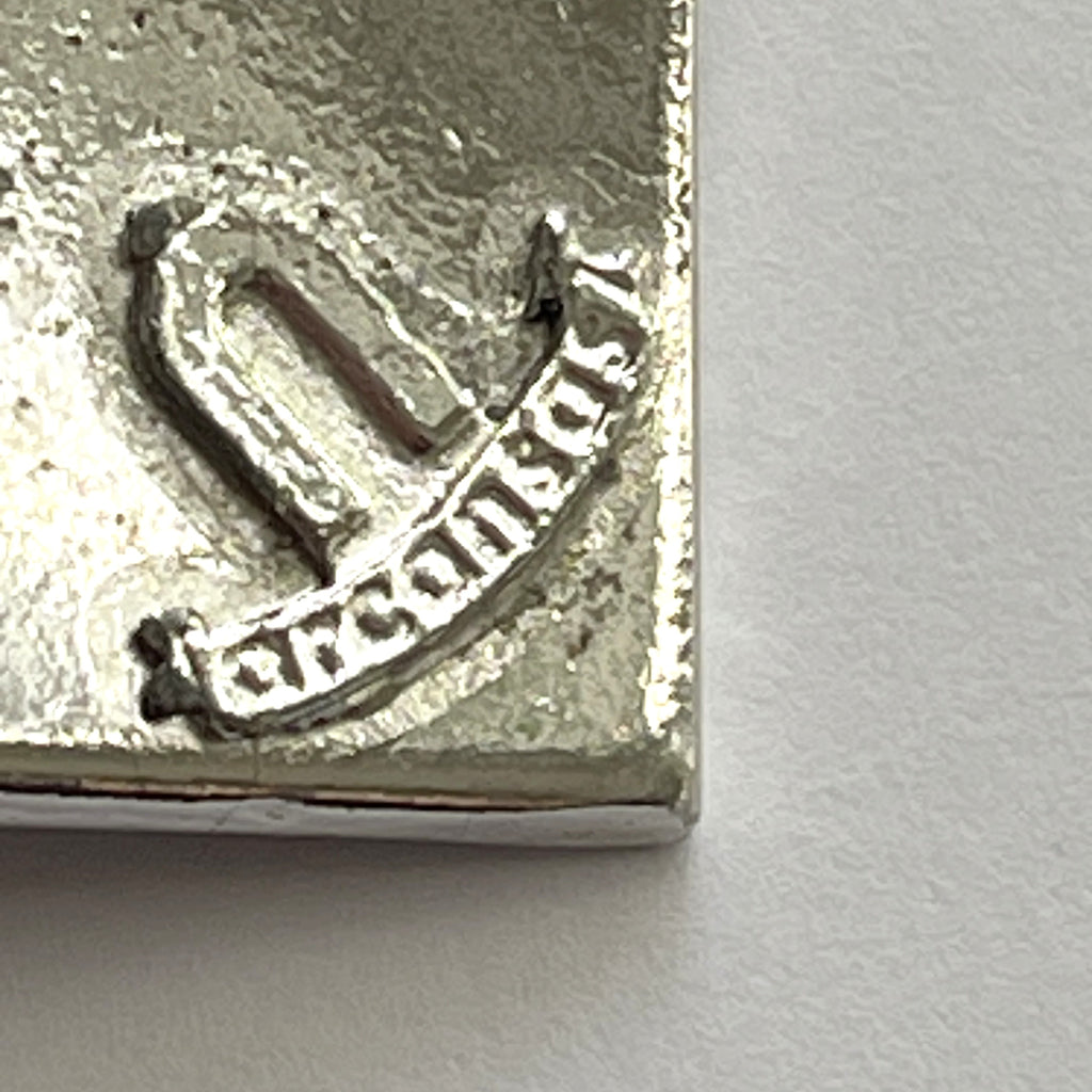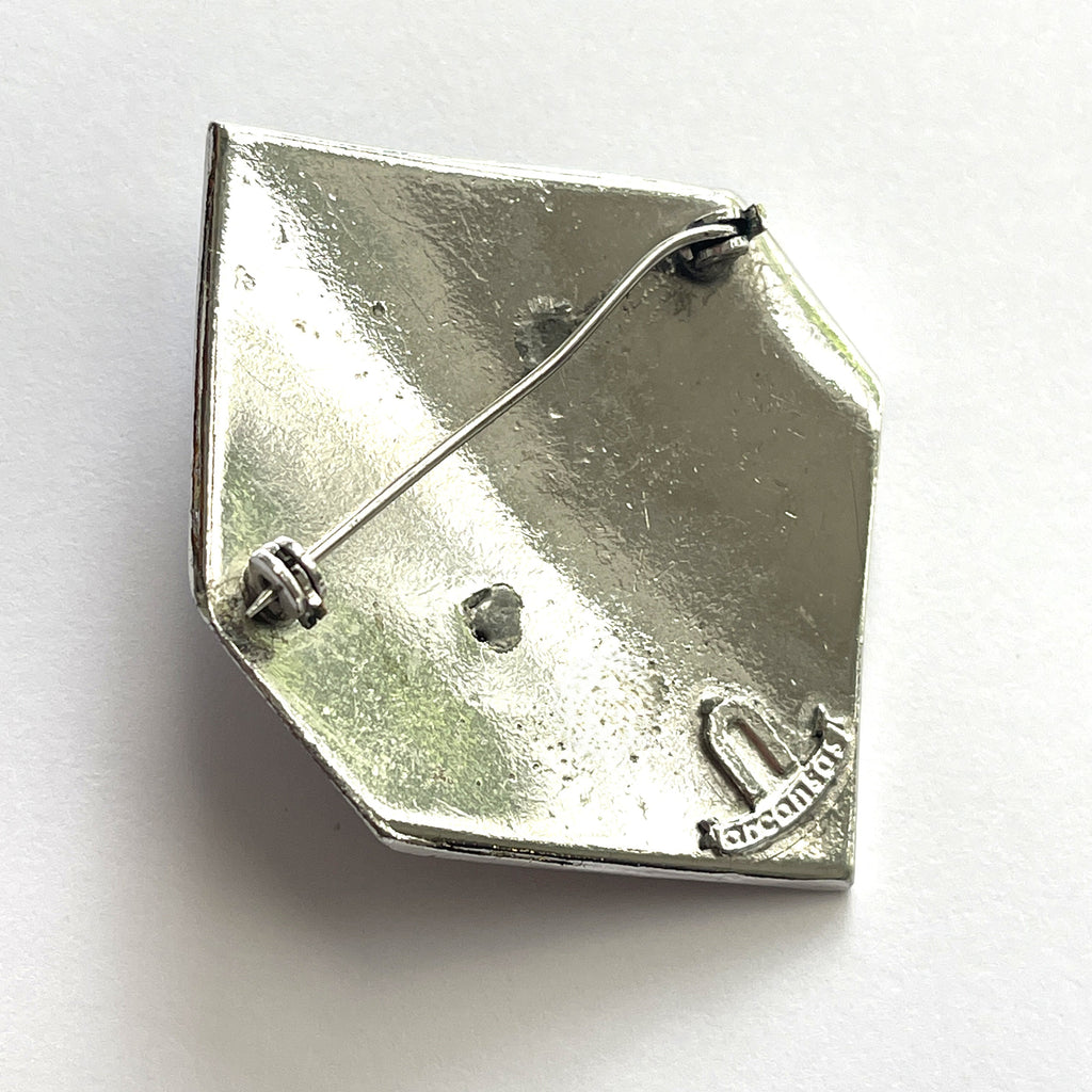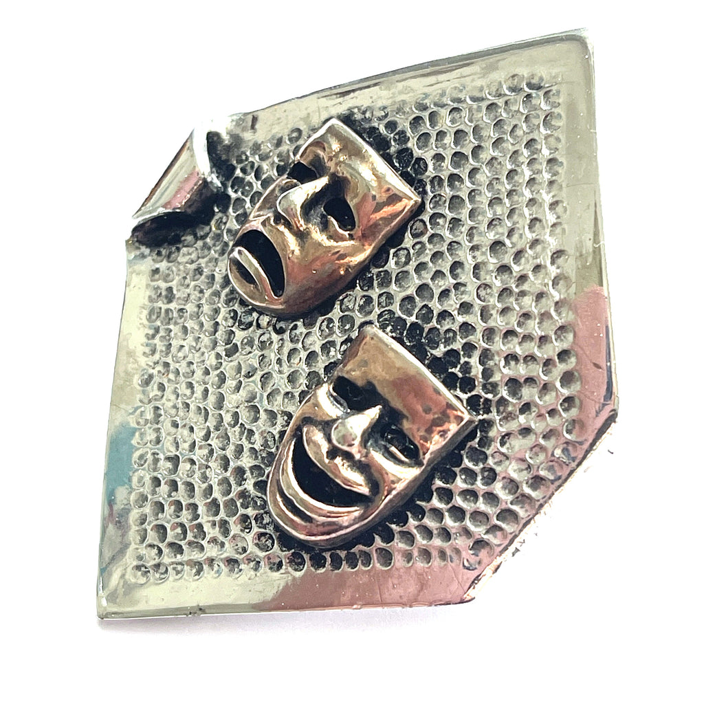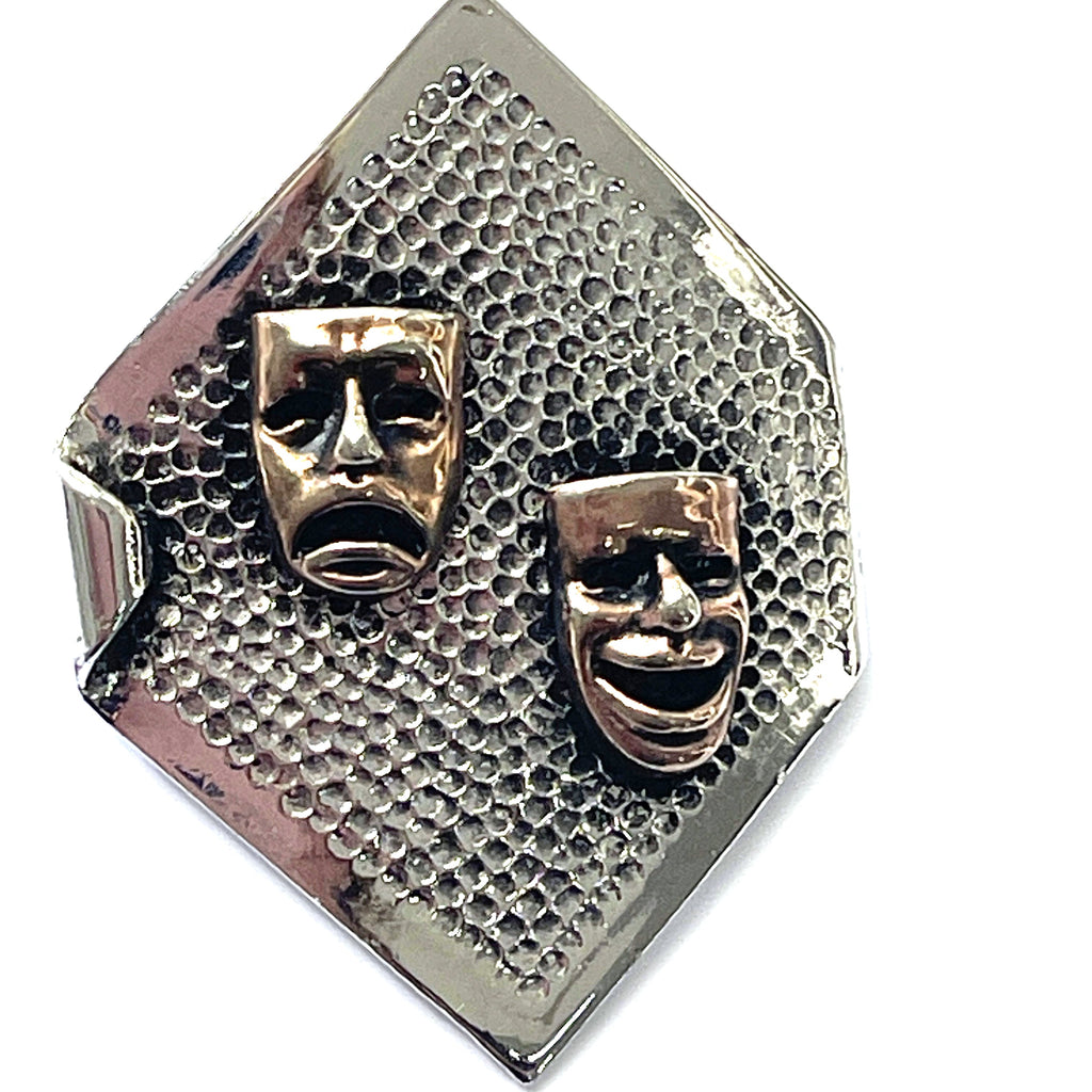 The Australian Costume Jewellery Company Arcansas was founded in Sydney in the early 1950's by Hungarian Migrant Elizabeth Reimer. It was a very successful business originally run from her home before moving to factory premises. She used innovative designs, some looking back to antiquity and some more modern as this one which has the symbols of the theatre - the faces of tragedy and comedy. The company progressed to sell overseas, and was eventually closed when Elizabeth retired in the 1970's. Her pieces are highly collectable today. Measurement is 3cms x 2cms x 3cms along the 6 sides. A lovely example in excellent condition. Marks to the front of the piece in the photographs are simply light reflection. There are a couple of small wear marks to the back, along with the firm roll over safety clasp and the ARCANSAS signature plate. Gift boxed by Vintageonline.