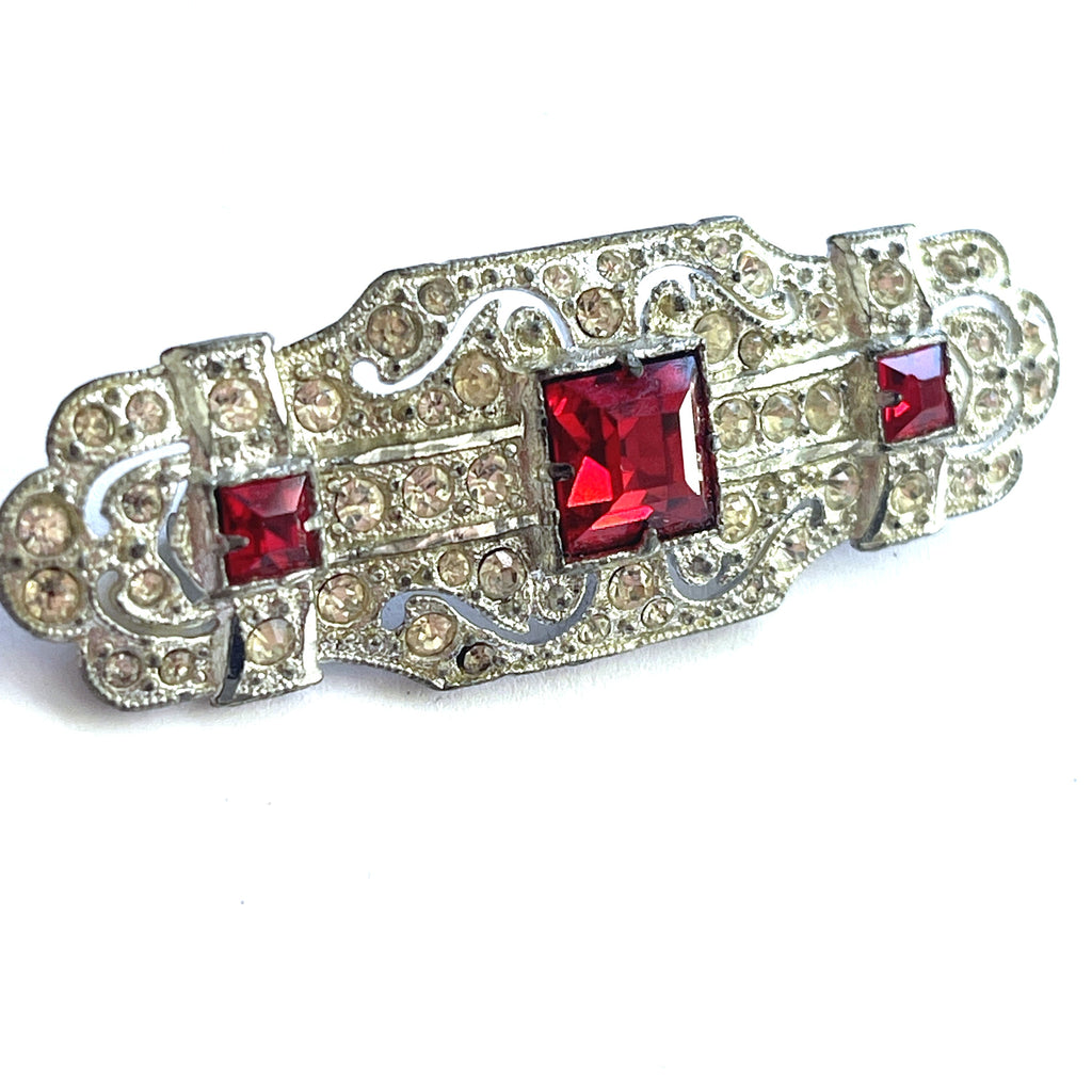 A beautiful brooch recently arrived from USA. Typical in design of the late art deco era. Clear rhinestones set in pot metal with three ruby red square rhinestones. Overall dimension is  6cms x 2cms. There is a firm roll over safety clasp to the back. Very pretty, in excellent condition, gift boxed by Vintageonline.