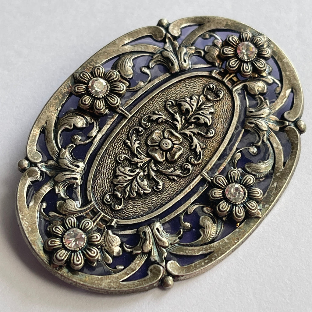 After discovering a treasure trove of antique jewellery moulds from the 1900's to 1930's during the early 1980's, Catherine Popesco used them to create hand made jewellery reviving the style of Art Nouveau and Art Deco eras. Her workshop was originally established in the Loire Valley, France using traditional French techniques, such as hand setting crystals and using a base of silver or copper.  The gaps in between the brooch decoration is filled in with a lilac vermeil. The brand is now part of the company Au Bout de Reves, under the name La Vie Parisienne and is still in business today, with a more modern style being produced. These lovely 80's brooches are highly collectable and this is a lovely example. Overall dimension is 5.5cms x 4cms. Pewter with raised floral emblems and hand set crystals. The Catherine Popesco signature France, is to be back along with a firm roll over safety clasp.  In excellent condition, gift boxed by Vintageonline.