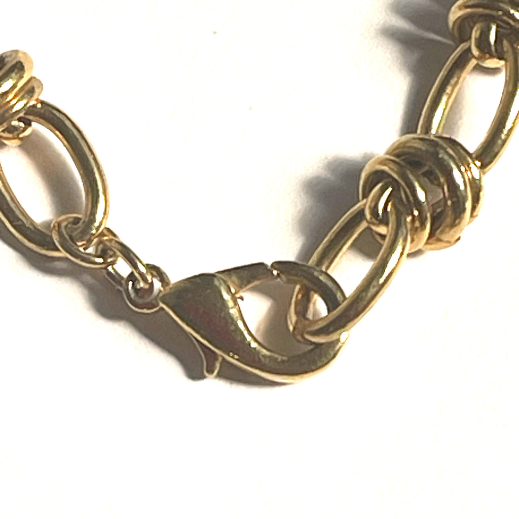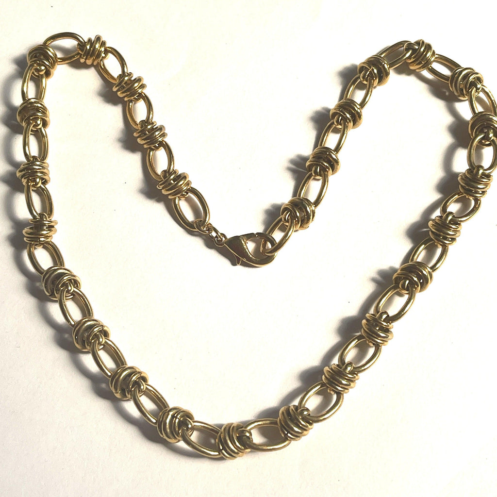 Another beautiful necklace from the wharehouse in London which had been closed in the 1980's and re opened in recent times. The wonderful thing about this style is getting the look of gold without the price tag, something synonymous with the bold look of the 1980's period. Its a quality piece. The chain measures 44cms end to end, fabulous choker style., with loops and knots, ending with a firm lobster clasp. It is in perfect condition, gift boxed by Vintageonline. Perfect for wearing alone, or layering with others.