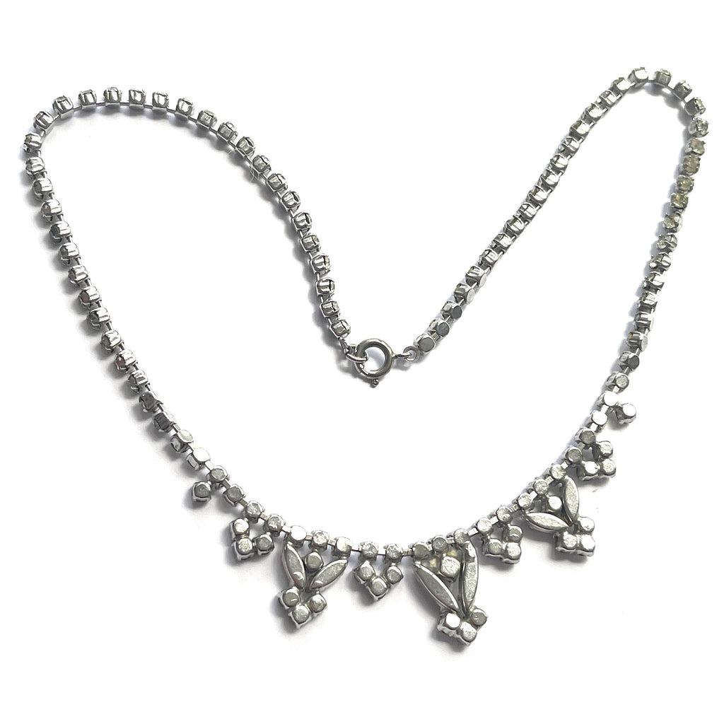 Clear rhinestone necklace from the 1960's period when it was the go to accessory for dressing up. Recently arrived from UK. Nowadays its fabulous to wear with any outfit, denim to lace. A single strand of small rhinestones with the centrepiece petal shaped drops. Length of the necklace end to end is 38cms, so will sit at the throat, choker style on most necks (otherwise an extender could be added). It is finished with a firm spring clasp. In good pre loved condition, authentic vintage, gift boxed by Vintageonline.