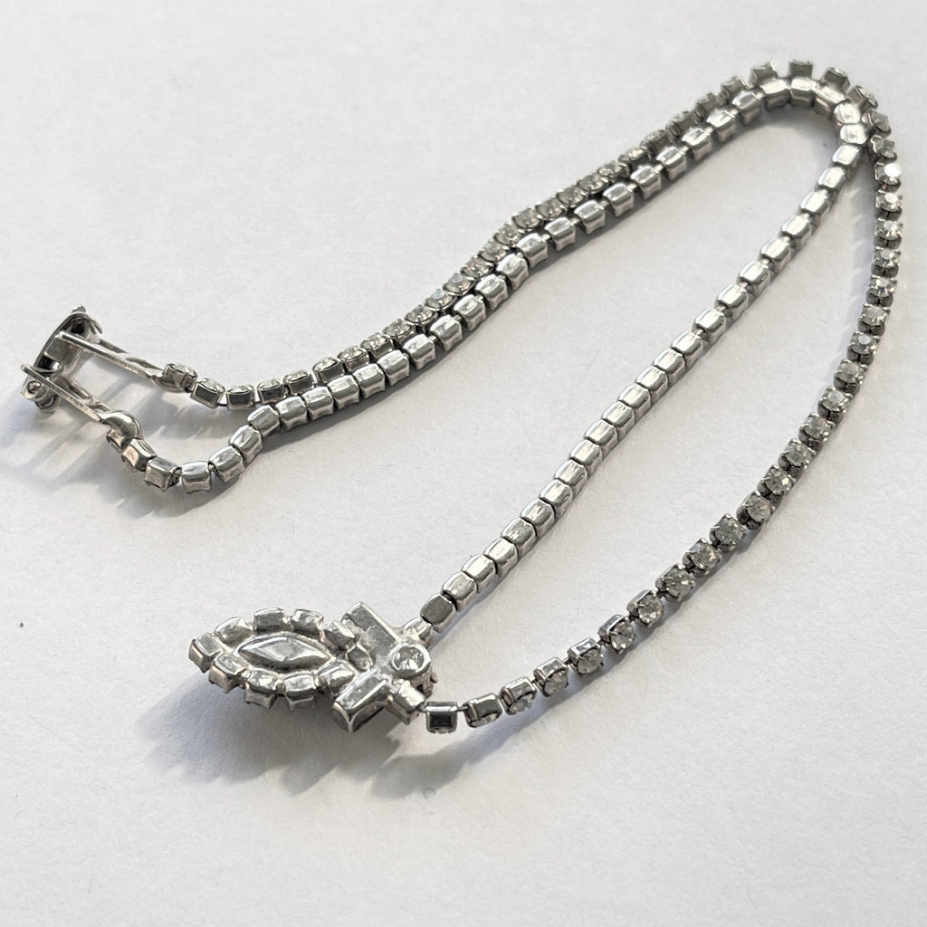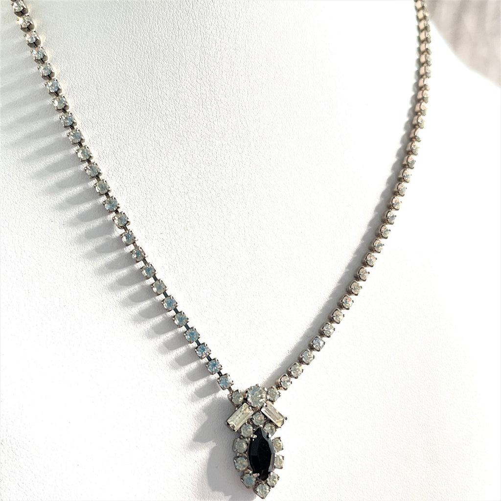 Gorgeous rhinestone vintage necklace from the 1960's set in silver tone metal with 40cm rhinestone chain end to end finished with a firm roll over clasp. The centrepiece is a black oval rhinestone prong set and faceted to catch the light in a frame of clear rhinestones. Very pretty and in excellent pre loved condition. Measurement of the centrepiece is 2cms x 1cm. Gift boxed by Vintageonline.