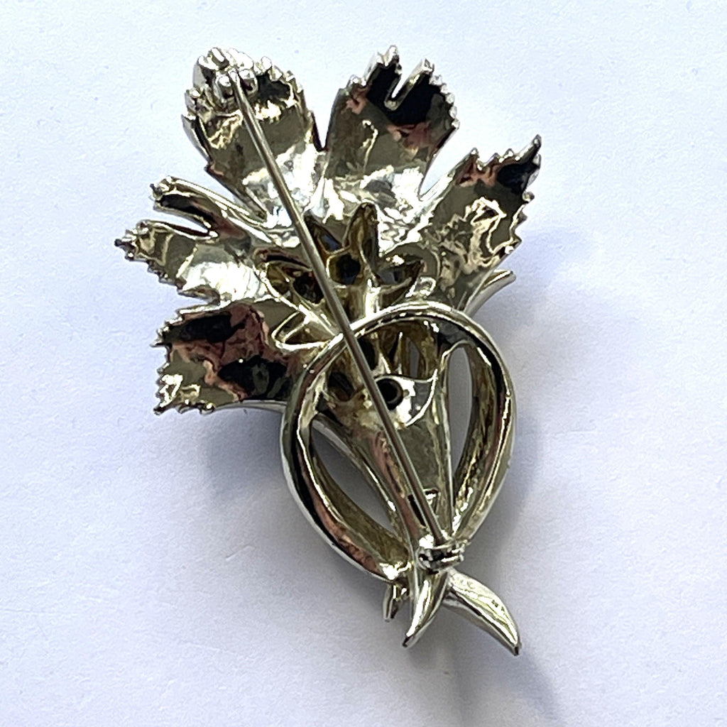 A recent arrival from USA, six tear drop shaped rhinestones with aurora borealis finish to catch the light, set within a sheaf of silver tone metal set with small rhinestones. Overall dimension is 7.5cms x 5cms. There is a firm roll over safety clasp to the back. In very good condition, gift boxed by Vintageonline.