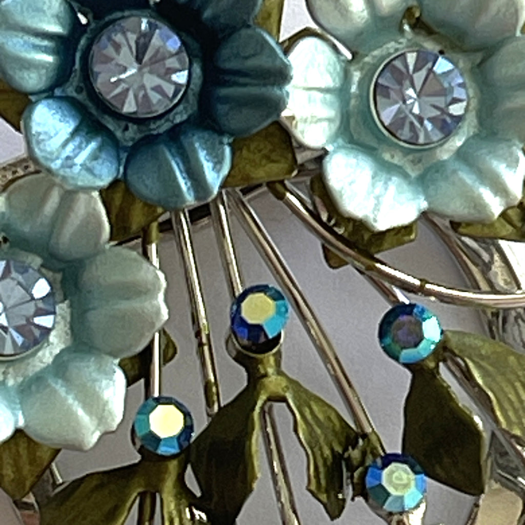 Such a pretty dress clip recently arrived from USA. Measuring 4.5cms x 3.5cms., three larger flower heads enamelled in blues and centred with a blue rhinestone with streamers of smaller flower heads and rhinestones with aurora borealis finish to catch the light. Set in silver tone metal with a firm clip. Gorgeous to wear as a brooch at the V of a neckline, or on a jacket or shirt, or hat. In perfect condition, gift boxed by Vintageonline.