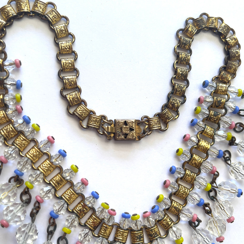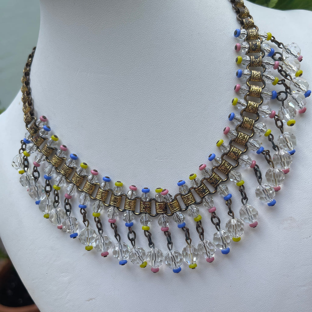 A gorgeous early mid century statement necklace, dating to between 1940'-1950's featuring c;lear faceted crystal beads o9f varying sizes accented with pastel spacer beads. The necklace is built on a brass patterned book chain and secured with a box clasp. While often associated with vintage designers like Miriam Haskell, this is an unsigned piece in good condition with a little wear to the book chain which is appropriate to its age and gives it an antiqued effect. It is designed to sit gracefully on the collarbone with a length of 40cms end to end. The fringe or waterfall element consists of cascading dangling chains that add movement and shimmer. The "book chain" refers to interlocking flat folded metal links that resemble the binding of a book. Old Hollywood allure, gift boxed by Vintageonline. Free Express shipping within Australia.