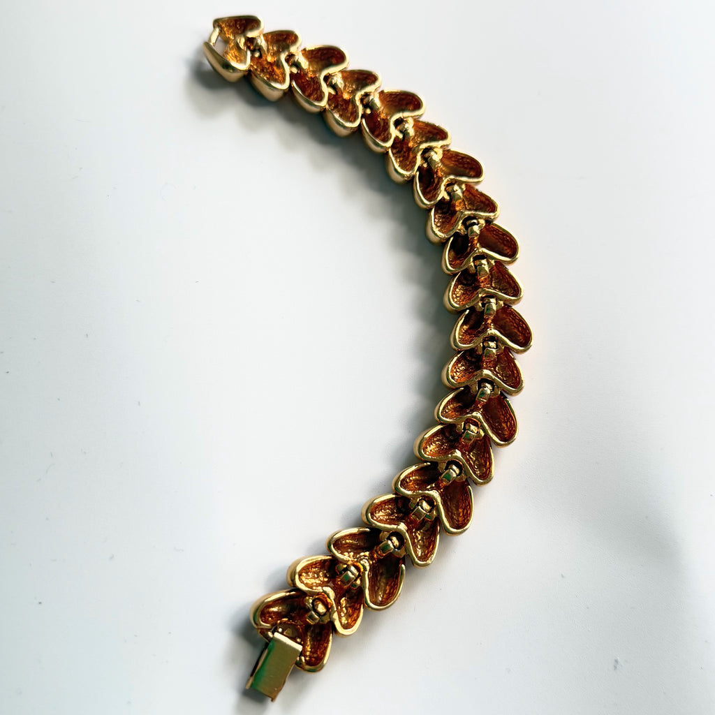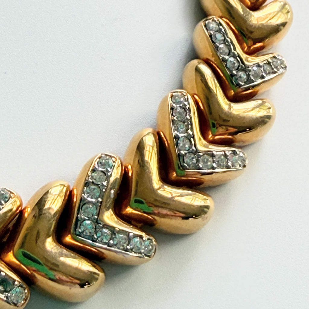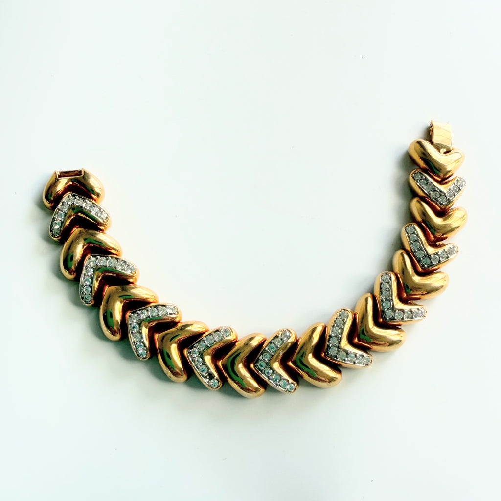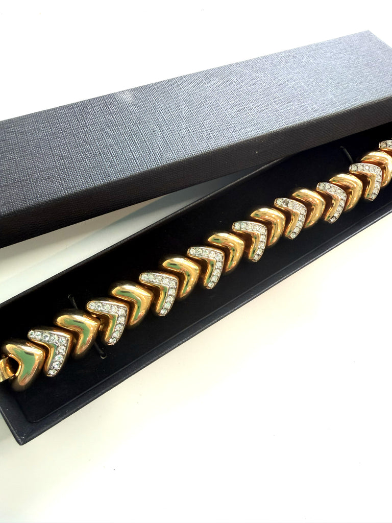 In excellent condition 18 heart shapes alternating with plain gold tone and channel set rhinestones. Flexible and easy to wear. A recent arrival from USA, unsigned but obviously a quality piece, much in the style of the late 1980's and in to the 1990's. Width is 2cms, and length end to end is 20cms finished with a firm fold over clasp. A great gift for yourself or someone you love. Gift boxed by Vintageonline.