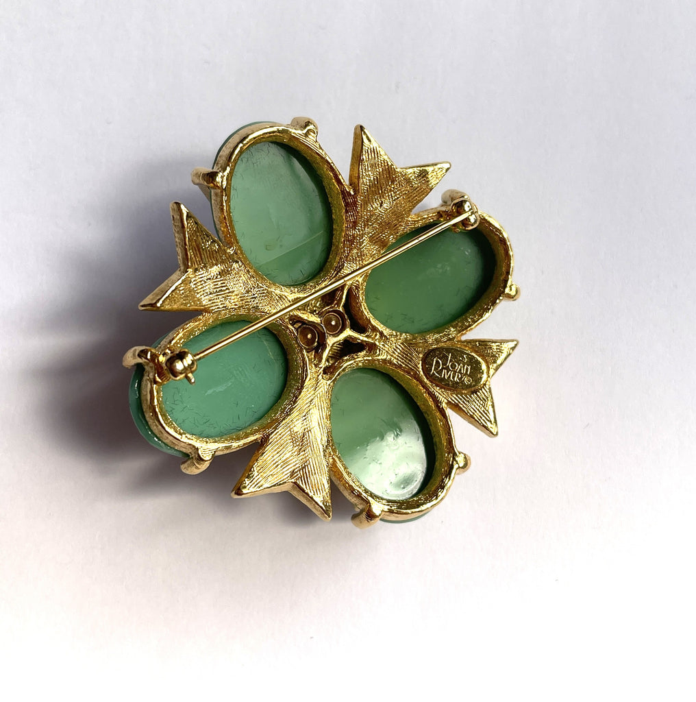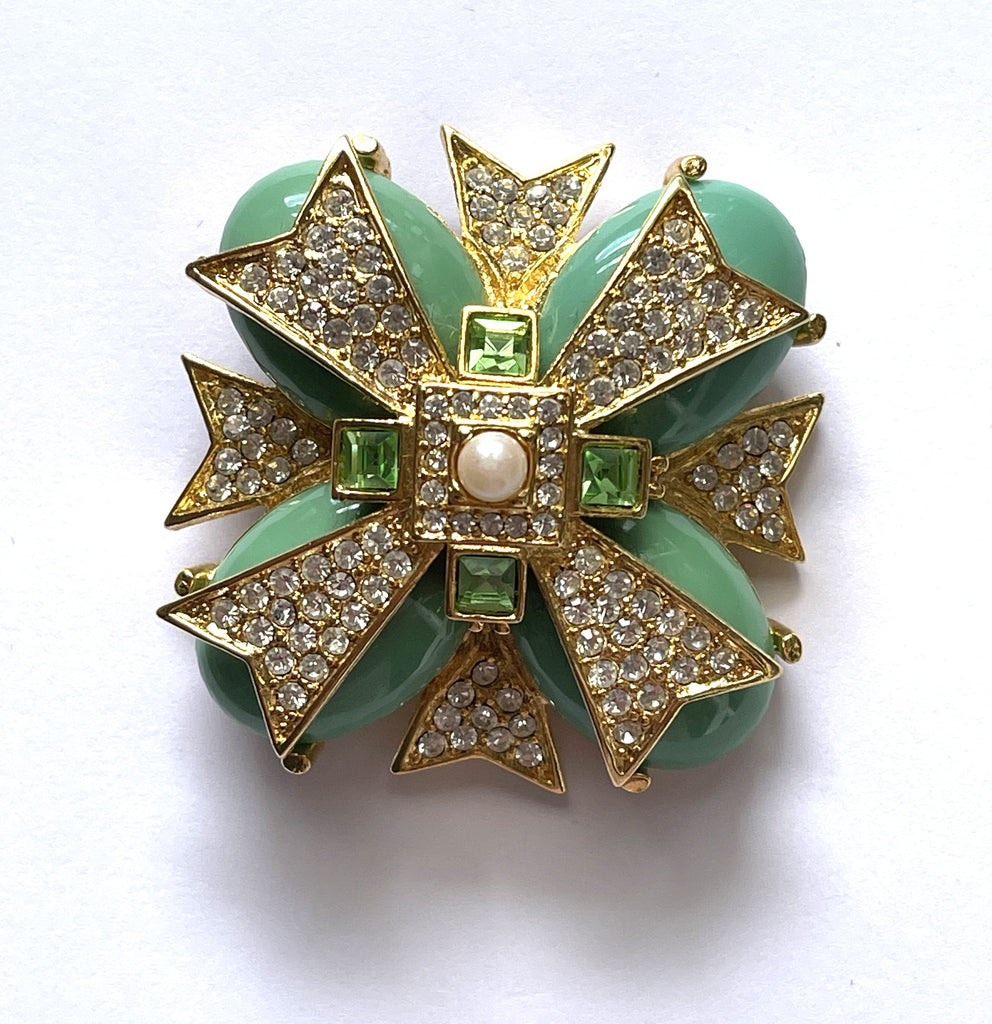 Here we have a classic example of her elaborate designs with a combination of high quality faux jade gemstones and sparkling rhinestones with central pearl. The highly stylized Maltese Cross was a recurring motif in the Joan Rivers Classics Collection. The large smooth rounded green stones made of lucite are intended to mimic jade or poured glass.