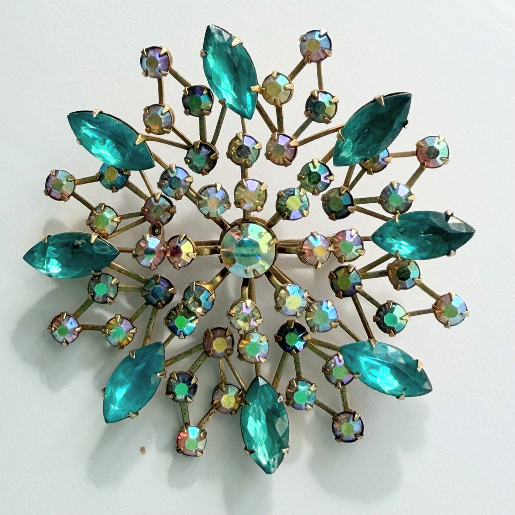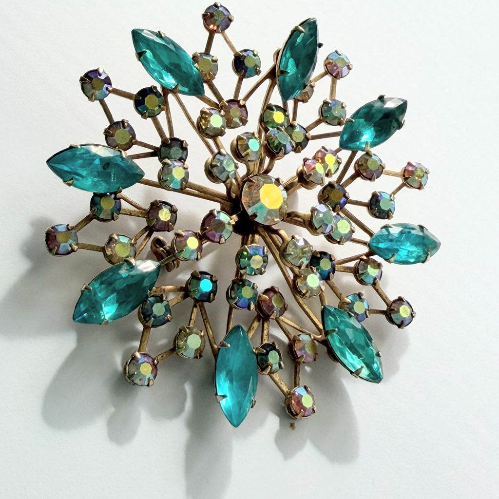 A very pretty rhinestone vintage brooch recently arrived from USA. Set in rivetted gold tone metal with a vibrant combination of clear rhinestones with aurora borealis light that reflects a rainbow of colours, and tear drop shaped aqua coloured rhinestones, each one prong set and fully faceted. Quite substantial in size at 7cms across, and a firm roll over safety clasp to the back. In very good condition, a 1960's era piece gift boxed by Vintageonline.