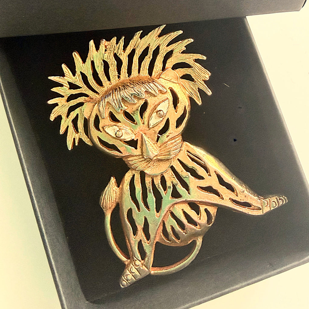 He honestly brings a smile to your face. He is so cute ! He is kind of a shaggy lion with his solid gold tone figure and enamelled eyes. Overall size is 5.5cms x 7cms. He is a substantial statement in very good condition, with a firm roll over safety clasp to the back.