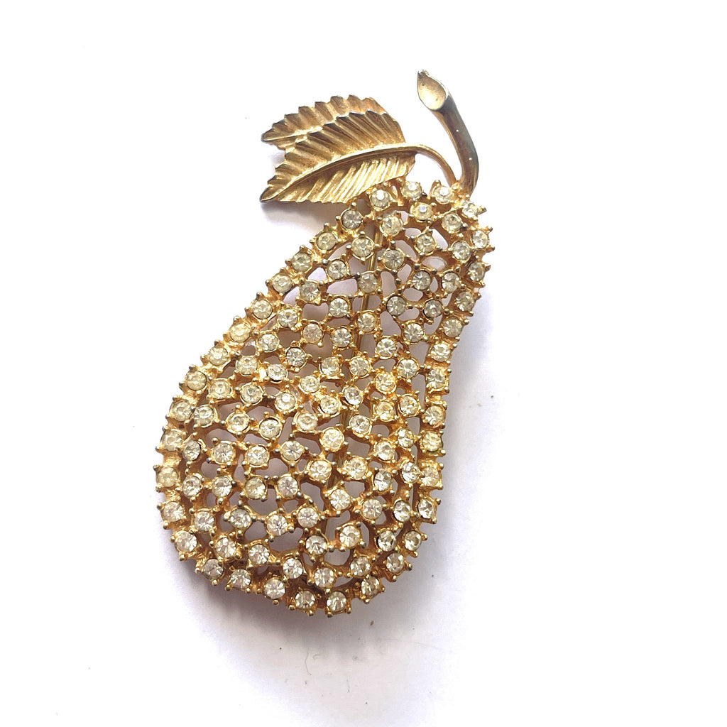 Recently arrived from USA...a large pear shaped brooch set with rhinestones, set in gold tone metal. A season of fruitfulness and new growth...the symbolism of brooches. It is substantial in size at 7cms length, and 4cms across at the widest point. There is a signature to the back "Stanley" which is unknown to me, along with a copyright sympol. There is a firm roll over safety catch. In good vintage condition, gift boxed by Vintageonline.
