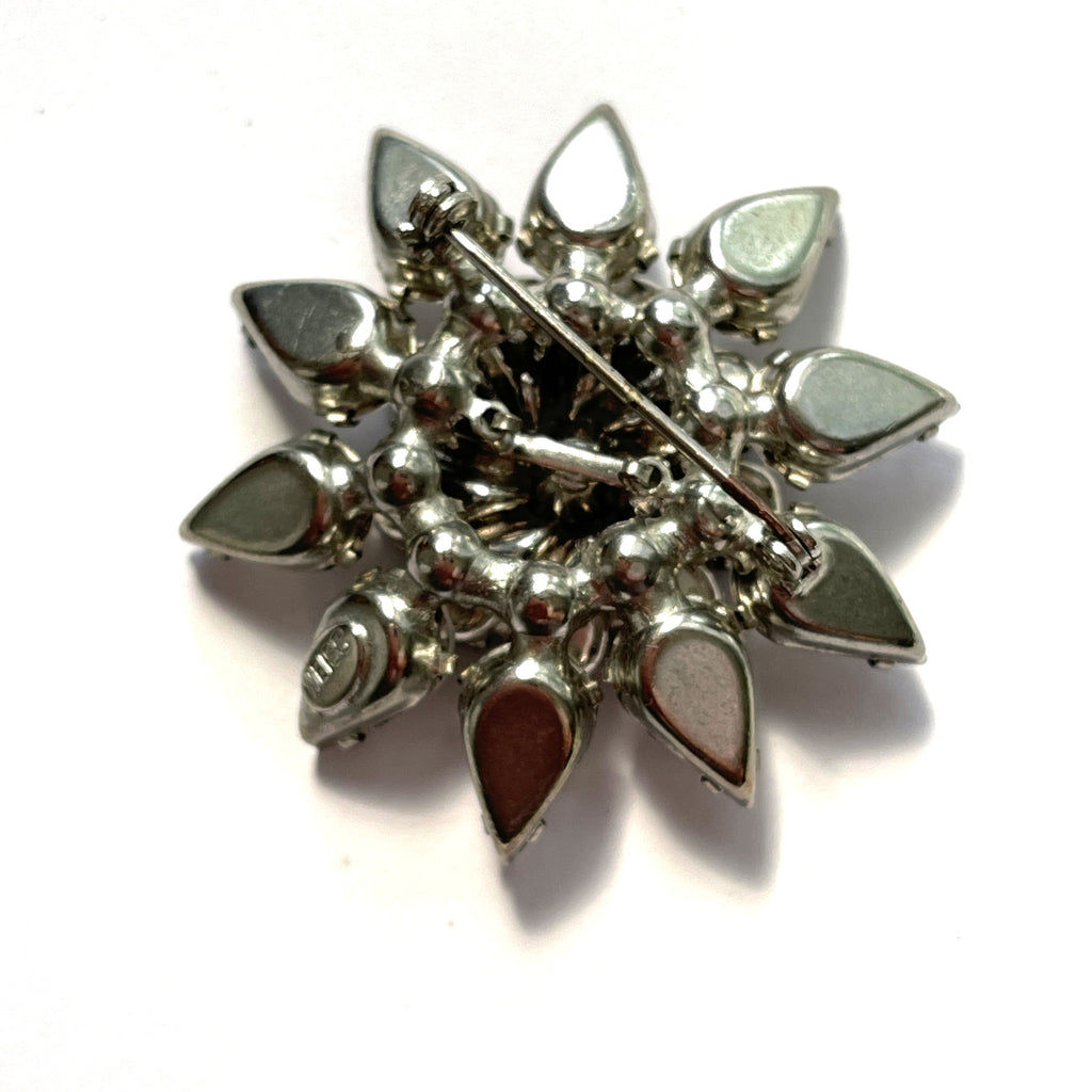 The Weiss Jewellery Company was founded in New York, USA in 1942 and was in business until the 1970's/ Their rhinestone brooches from the 1960's period, like this one are highly collectable today. They have a reputation for high quality rhinestones and workmanship. This is a lovely starburst example, and clear rhinestones are fabulous to wear with any outfit from denim to silk. Width across the brooch is 4.5cms. Each rhinestone fully faceted to catch the light, set in silver tone metal with a firm roll over safety catch to the back along with the WEISS signature. In excellent condition and gift boxed by Vintageonline.